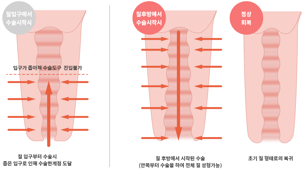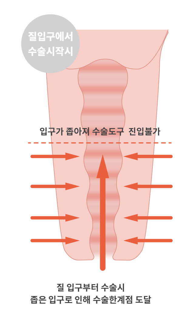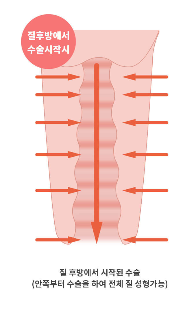 좁은 질구의 수술은 질입구부터 수술 진행시 좁은 입구로 인해 질안쪽의 수술은 불가능해 결국 질입구만 좁고 질안쪽은 넓은 형태가 될뿐입니다. 본원은 질안쪽(후방)에서 질바깥쪽(입구)으로 수술을 진행하여 전체적인 질성형을 함으로써 레이저나 이물질을 이용한 단순 질수축수술에서 야기될 수 있는 부작용인 질입구 경직현상없이 자연스러운 원래의 모습 그대로의 초기질 형태로 돌아가실 수 있습니다. 질 후방에서의 수술은 단기간에 습득할 수 없는 고난도의 의료기술로 많은 임상수술의 경험을 통한 본원 원장님만의 노하우입니다.