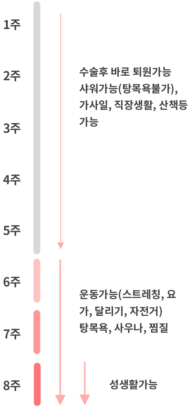 - 8주후 : 성생활가능 (지방거주나 바쁜 현대인, 해외거주자는 병원 내원 없이 자가 치료로 대체할 수 있으며 상세히 안내해드립니다)