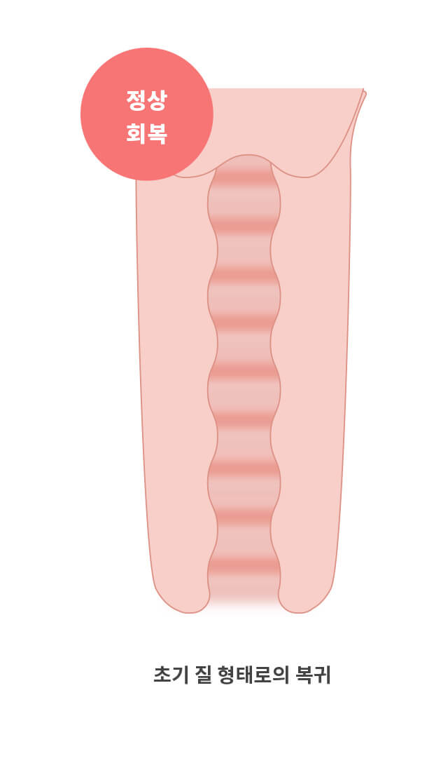 본원의 수술은 질 안쪽부터 입구까지 전체적으로 교정하는 수술이기 때문에 회복기간은 약 2달(8주) 정도 소요됩니다. 집안일이나 직장생활 같은 일상생활은 수술 당일부터 가능하며 웨이트 운동이나 무거운 물건을 드는 행동, 사우나 등은 6주 간 조심해주시면 됩니다.
